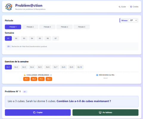 Chaque semaine des problèmes Challenge sont proposés pour les élèves plus à l'aise. Ces exercices ajoutent :