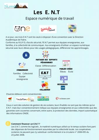 Un espace numérique de travail (ENT) désigne un ensemble de services numériques choisis et mis à disposition des enseignants, des élèves et des parents d'une école. Il s'intègre dans un cadre de confiance défini par un schéma directeur des ENT.